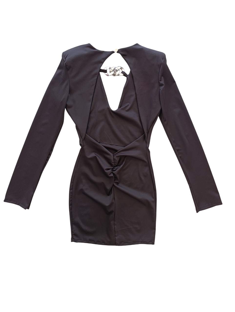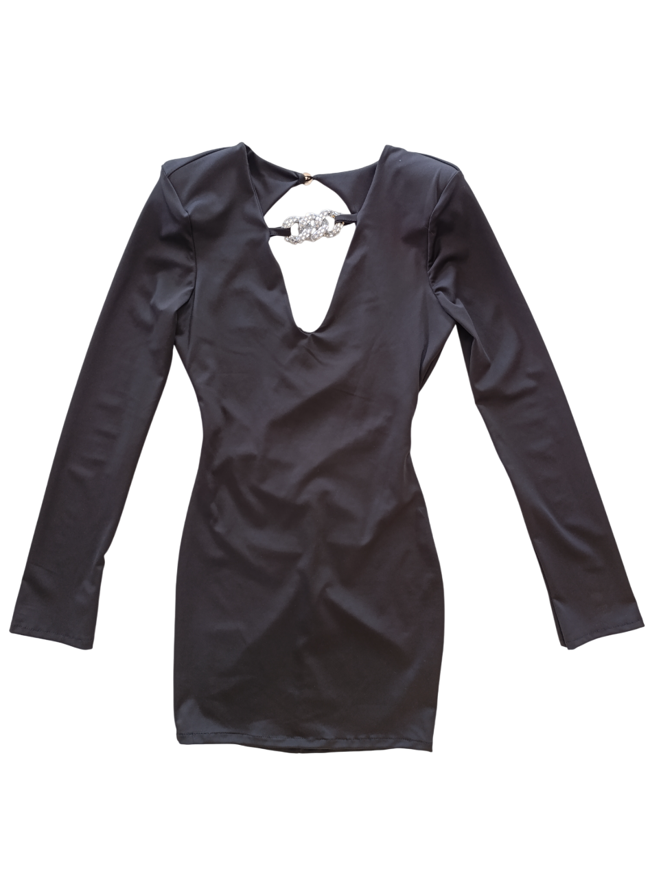 Mini abito elasticizzato a manica lunga dal design sensuale e sofisticato. Lo scollo a V profondo è impreziosito da un elegante decoro gioiello color argento che unisce le due parti del corpetto, aggiungendo un tocco luminoso e raffinato. La schiena scoperta e l’arricciatura sul fondoschiena valorizzano la silhouette con femminilità. Perfetto per serate speciali e occasioni glamour.