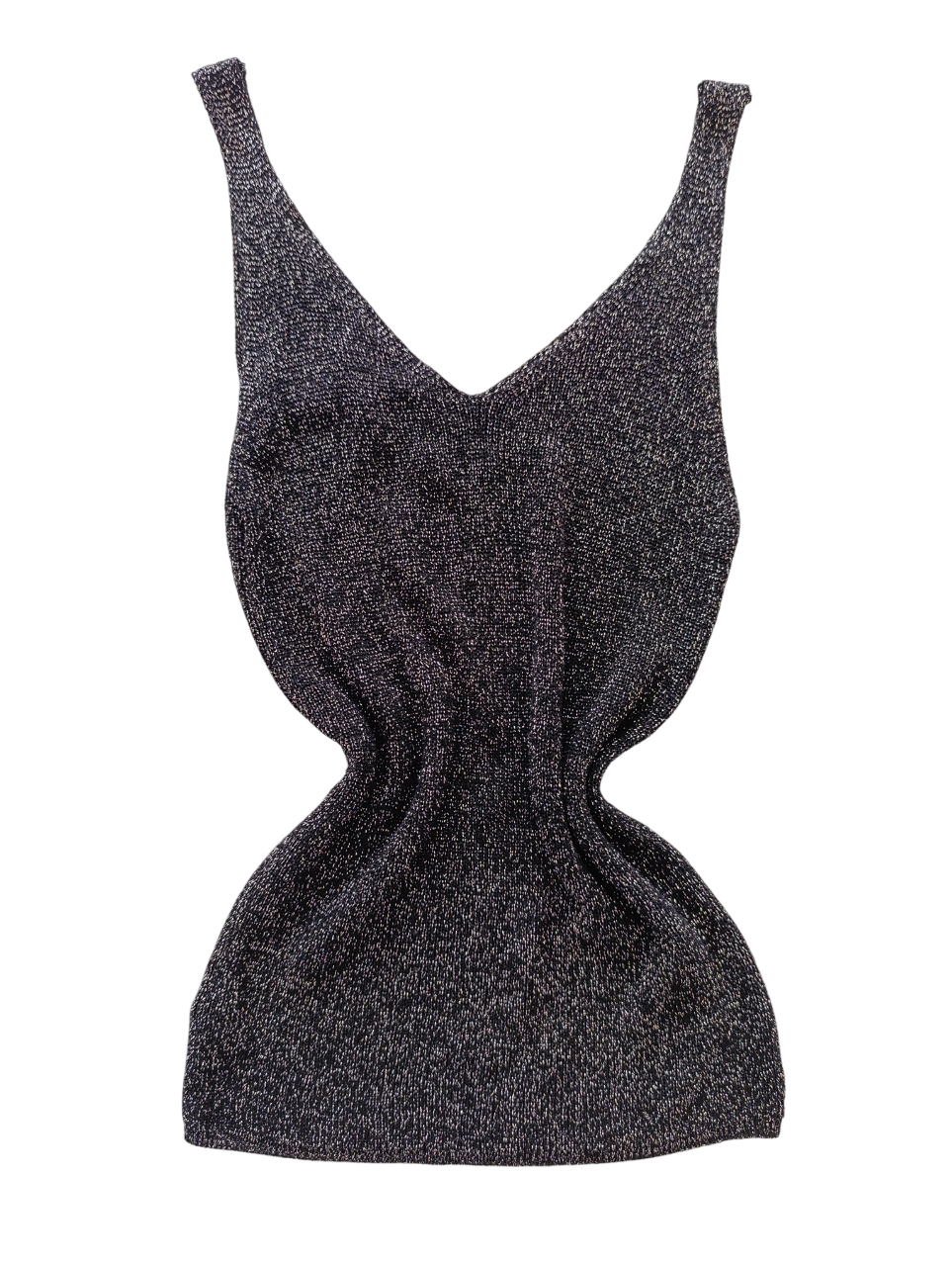 Realizzata in morbida viscosa elasticizzata, questa canotta offre comfort e vestibilità perfetta, seguendo delicatamente le linee del corpo. Il filo in lurex intrecciato al tessuto regala un tocco di luce e raffinatezza, rendendola perfetta per creare look eleganti e moderni.